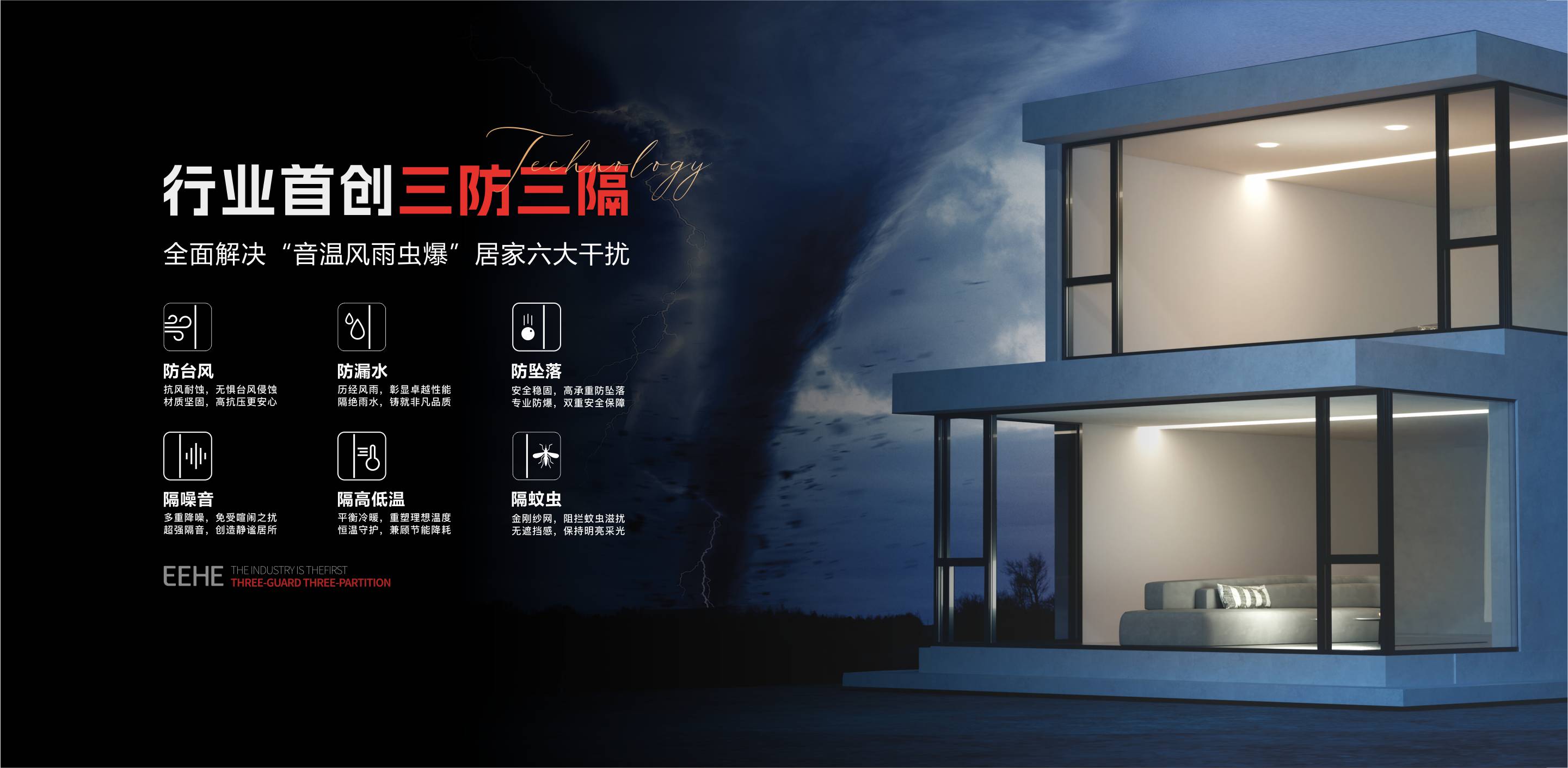 億合門窗通過“三防三隔”全防護系統(tǒng),重新定義好門窗標準,解決消費者居家干擾問題,實現(xiàn)安全與舒適的兼顧。